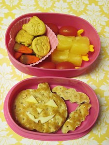 Happy Friday! Today’s bento has a slight Halloween theme happening. I used a pumpkin-shaped cookie cutter to make a jack-o-lantern chicken sandwich. I used a sharp knife to cut the facial features out of muenster cheese. I also used a small bat-shaped cookie cutter to make the two bat shaped sandwiches which are filled with Jif hazelnut spread.