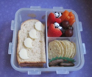 She also has strawberries, grapes, carrot sticks, and a couple grape tomatoes underneath.