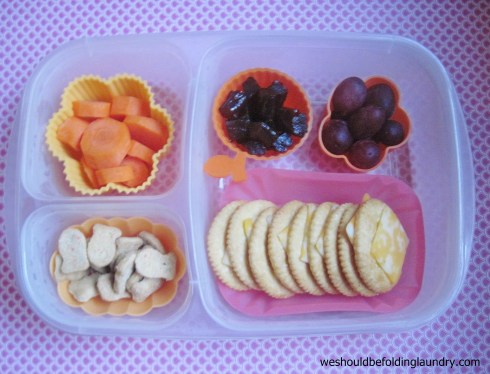 Cheese and crackers, grapes, natural fruit snacks, carrot coins, and vanilla cupcake flavored goldfish.