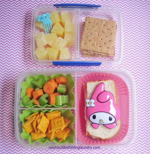 I usually pack her a little fruit and some crackers of some sort. Today its fresh pineapple and graham crackers.
